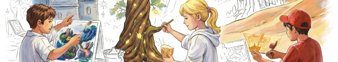 Les enfants créent les décors, ainsi que quelques éléments de costumes, d’un vrai spectacle de théâtre de l’association Les Oiseaux du Monde : La Légende des Trois Terres.