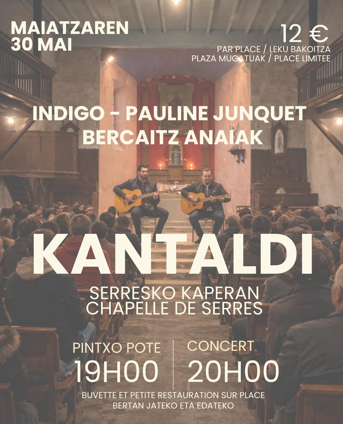 Kantaldi à la chapelle de Serres le samedi 30mai au soir. Avec Indigo, Berçaits Anaiak et Pauline Junquet. Kantaldi Serreseko kaperan maiatzaren 30-an, Indigo, Berçaitz Anaiak eta Pauline Junquet-ekin.