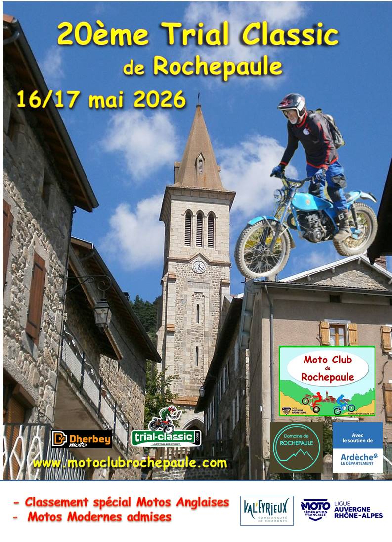 Le MOTO CLUB de ROCHEPAULE organise les 16 et 17 mai 2026, le 20ème Trial CLASSIC de ROCHEPAULE, épreuve FFM n°171, départ et arrivée au Centre Tout Terrain de Rochepaule 07. Le montant de l’engagement est fixé à 100,00 € pour les deux jours, possibilité de ne rouler qu’une journée au choix à 55,00 €. N’oubliez pas de remplir le BULLETIN D’ENGAGEMENT et de l’envoyer par mail à motoclubrochepaule@orange.fr ou par courrier à MC Rochepaule 3280 route du Vent Lichessol 07320 Saint Agrève.